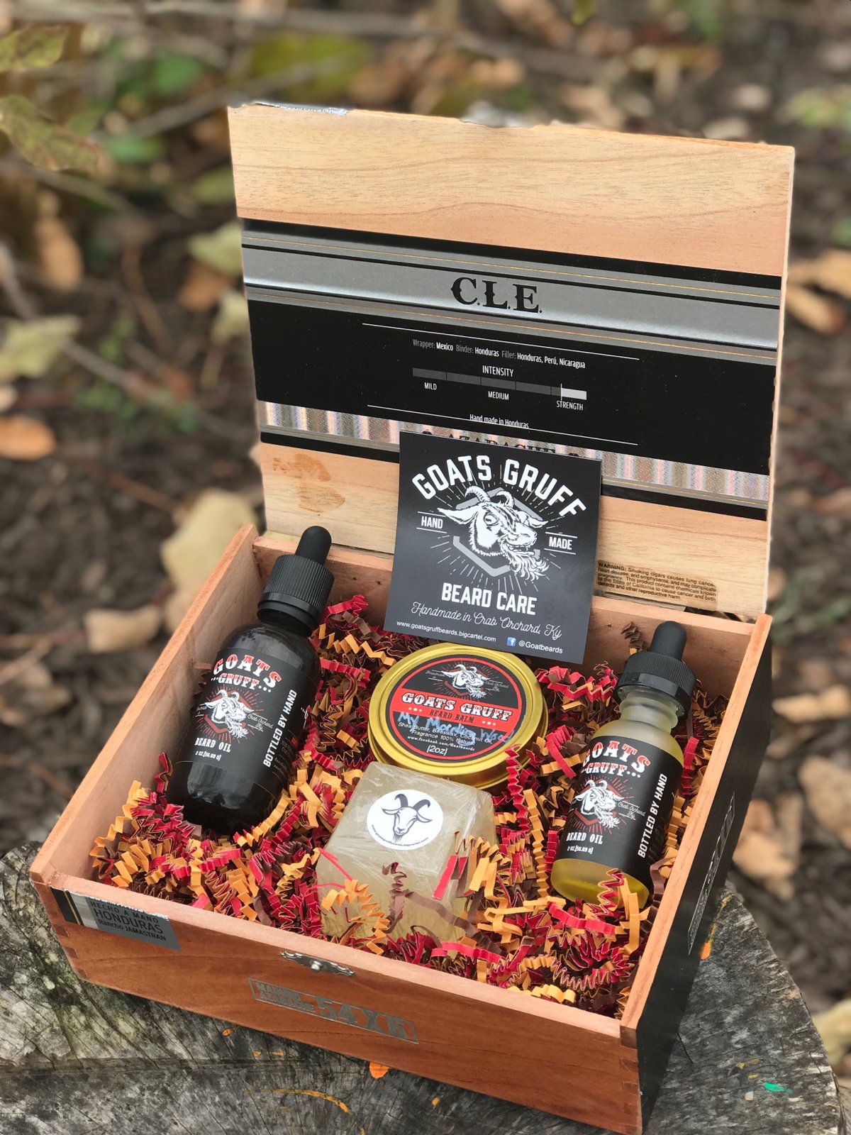 Treat your Man like the Big Billy Goat Gruff that he is, and bequeath to him this deluxe set! It comes in a gorgeous wooden cigar box (each one of a kind) and includes: